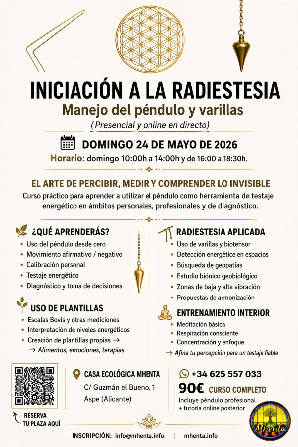 En este curso aprenderemos tambien nociones básicas  en la realización de estudios geobiológicos de viviendas o terrenos, búsqueda de  de geopatías perjudiciales para la salud, a través de radiestesia con el uso de las varillas  y péndulo.